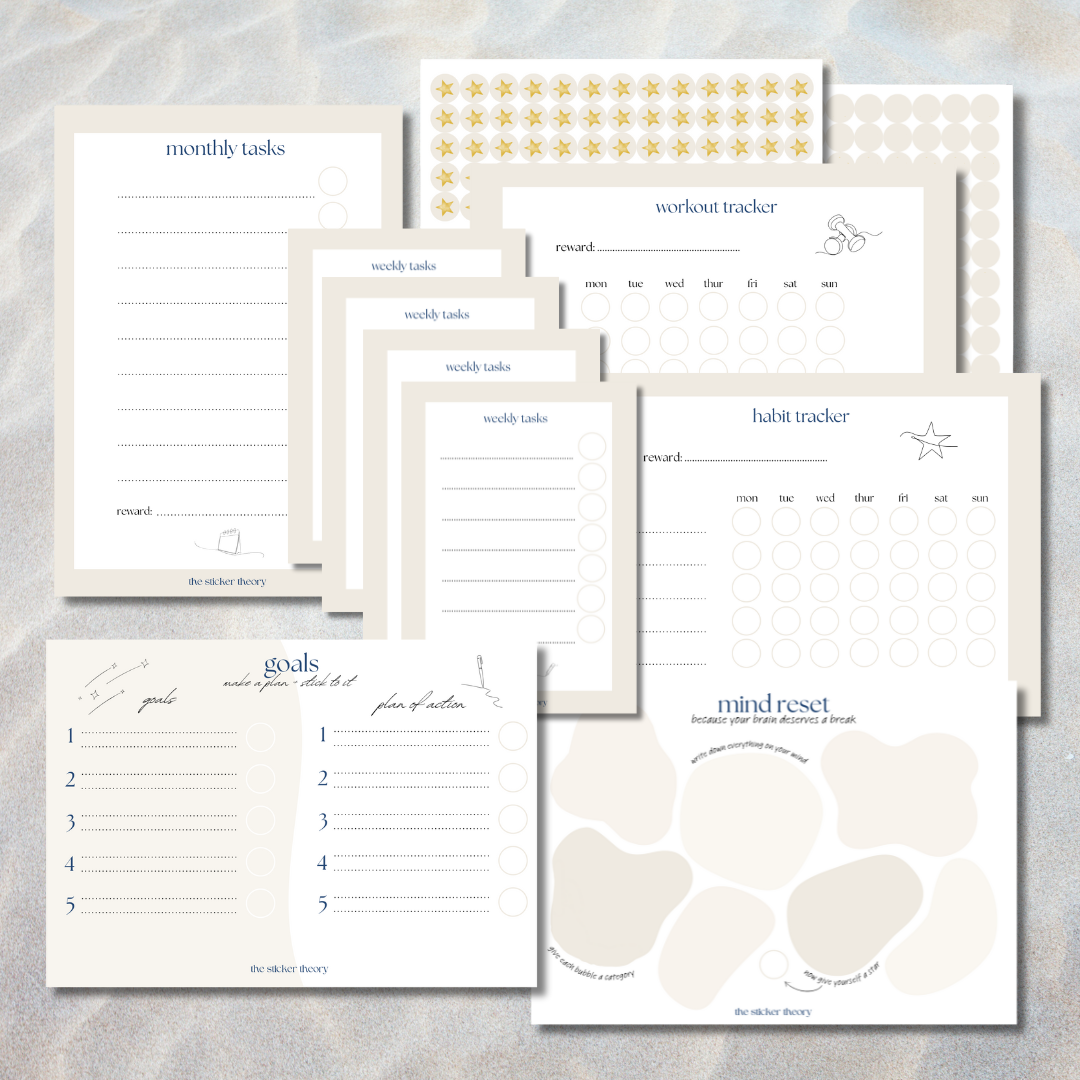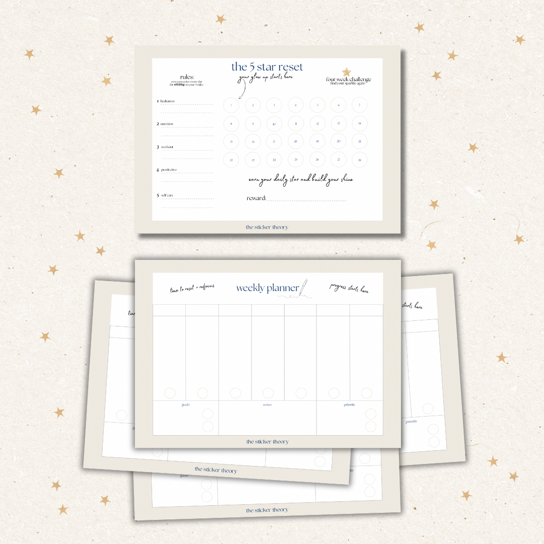 The set includes The 5 Star Reset Chart to track your progress, and 4 Weekly Planners to map your workouts, meals, habits and goals throughout the challenge, and of course all the star stickers you'll need.